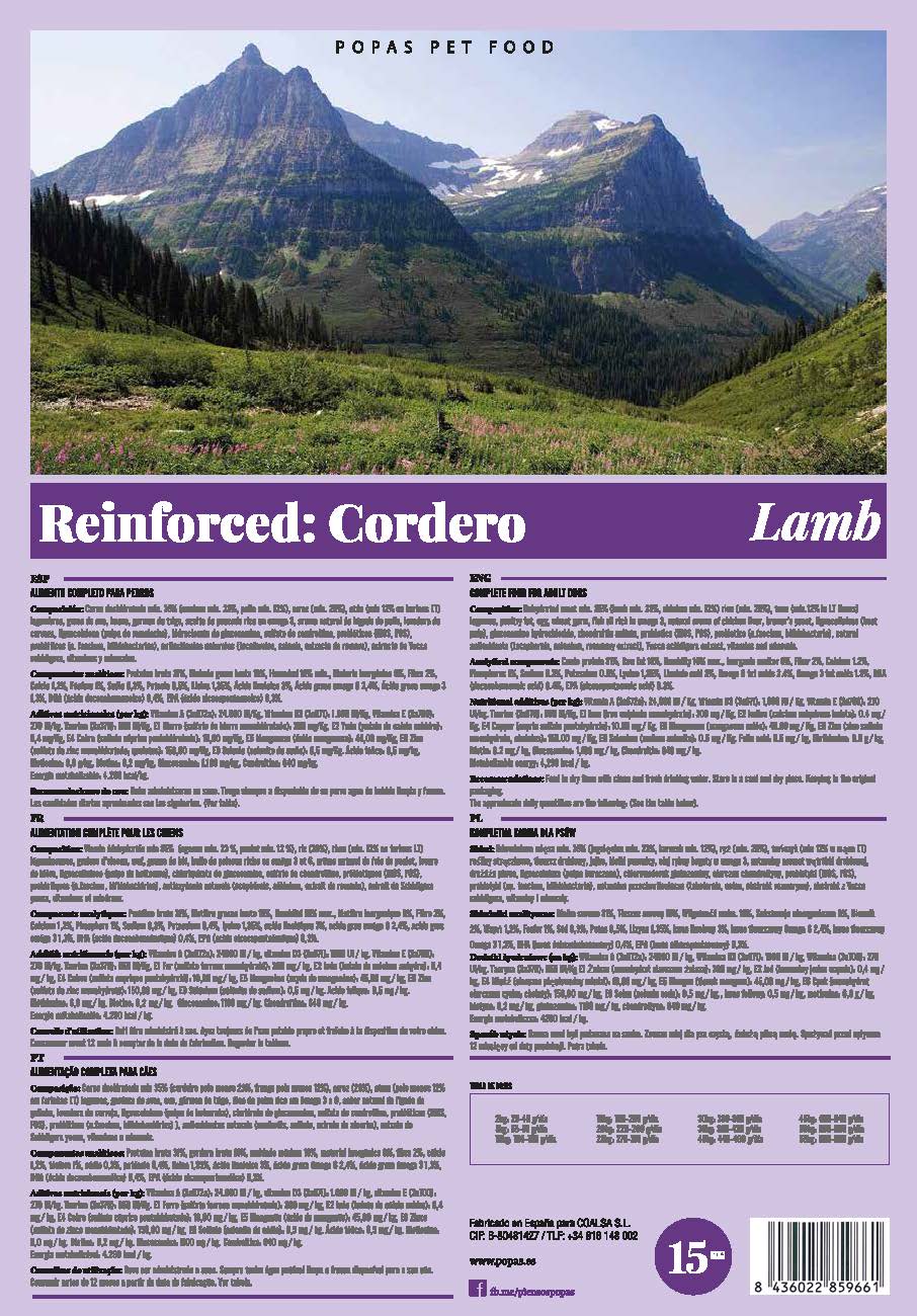Aditivos nutricionales (por kg): Vitamina A (3a672a): 24.000 UI/Kg, Vitamina D3 (3a671): 1.800 UI/Kg, Vitamina E (3a700): 270. Taurina (3a370): 1000, E1 Hierro (sulfato de hierro monohidratado): 130 mg/Kg, E2 Yodo (yodato de calcio anhidro): 0,3 mg/Kg, E4 Cobre (sulfato cúprico pentahidratado): 8 mg/Kg, E5 Manganeso (óxido manganoso): 35 mg/Kg, E6 Zinc (sulfato de zinc monohidratado; quelatos): 120 mg/Kg, E8 Selenio (selenito de sodio): 0,3 mg/Kg, Hidroclorato de glucosamina: 1.300 mg/kg, Sulfato de condroitina: 600 mg/k, L-Carnitina: 120 mg/kg, Ácido fólico: 0,5 mg/kg.